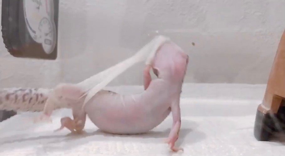 動画に映っているのは、「ヒョウモントカゲモドキ(レオパードゲッコー)」というヤモリのげぴちゃんが、脱皮しようとしている姿。